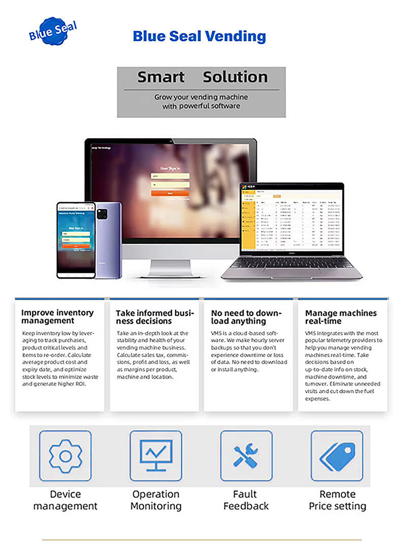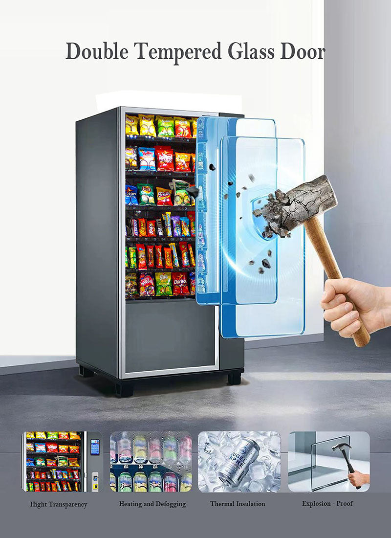 - 30 SKU Capacity - 6 shelves with 6 section each, offering a versatile ,Spiral Coil Goods Tray . 7" Touch screen, with software for reposting sales/ stock/profit data, Tempered 2-layer glass door with glass defogging system,3 keys supplied to open door with a push pick up door.