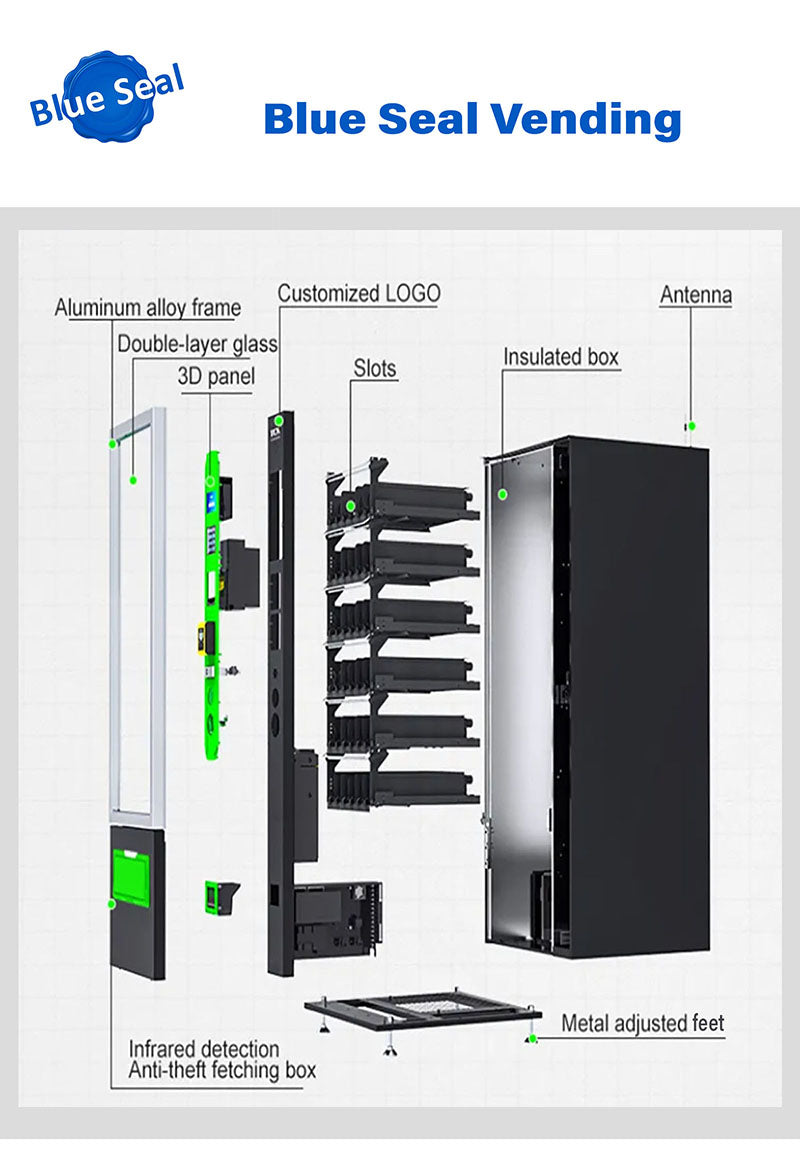 BLUE-1003C-GR-TNH is a high-performance Combo vending machine with 7" inch touch-screen, this quality modern machine provides an intuitive self-service experience, ideal solution for shopping malls, gyms, schools, and high-traffic and office warehouse areas.
