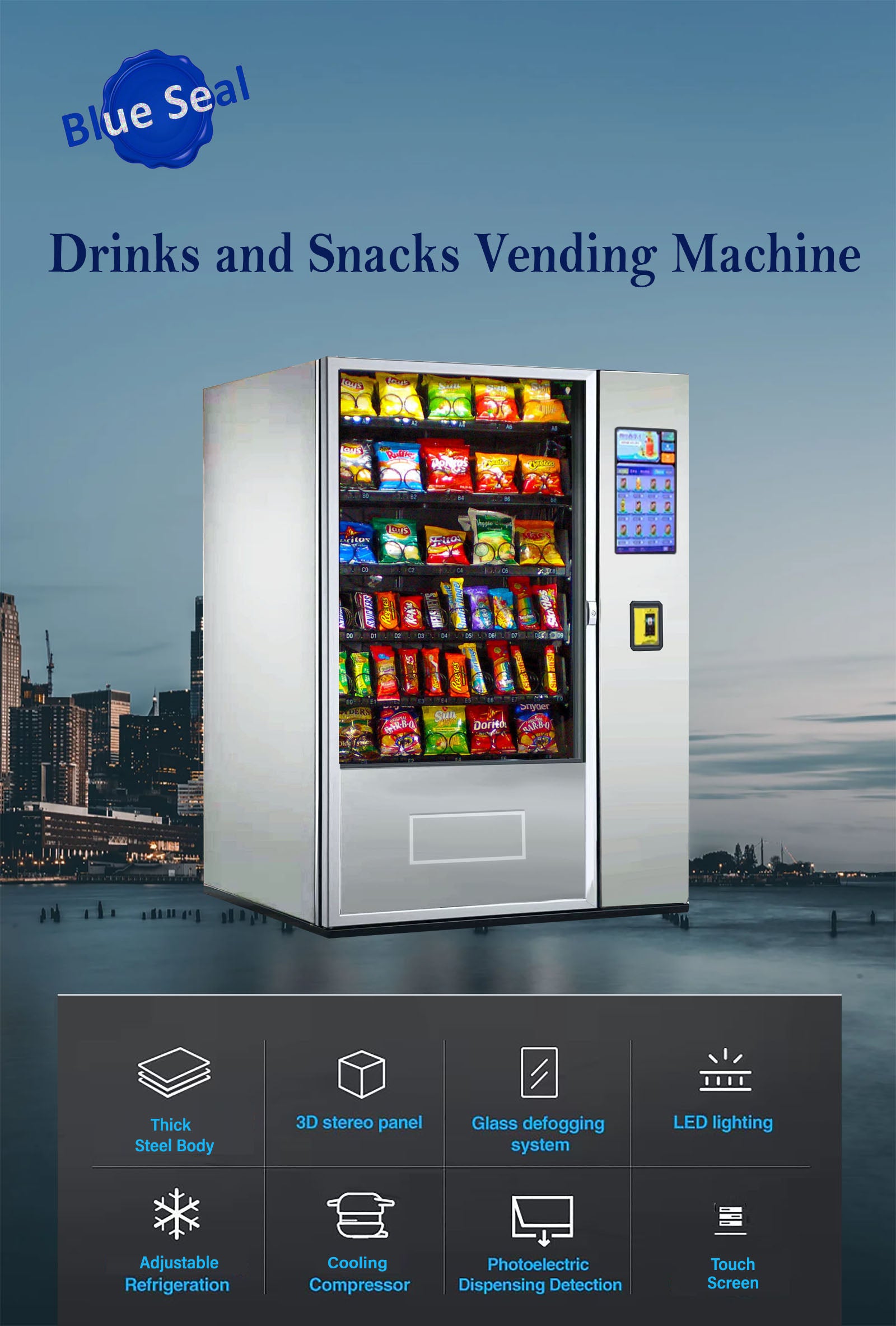 BLUE-1005S-SV-TCR is a high-performance Snacks vending machine with 21" inch touch-screen, this quality modern machine provides an intuitive self-service experience, ideal solution for shopping malls, gyms, schools, and high-traffic and office warehouse areas.